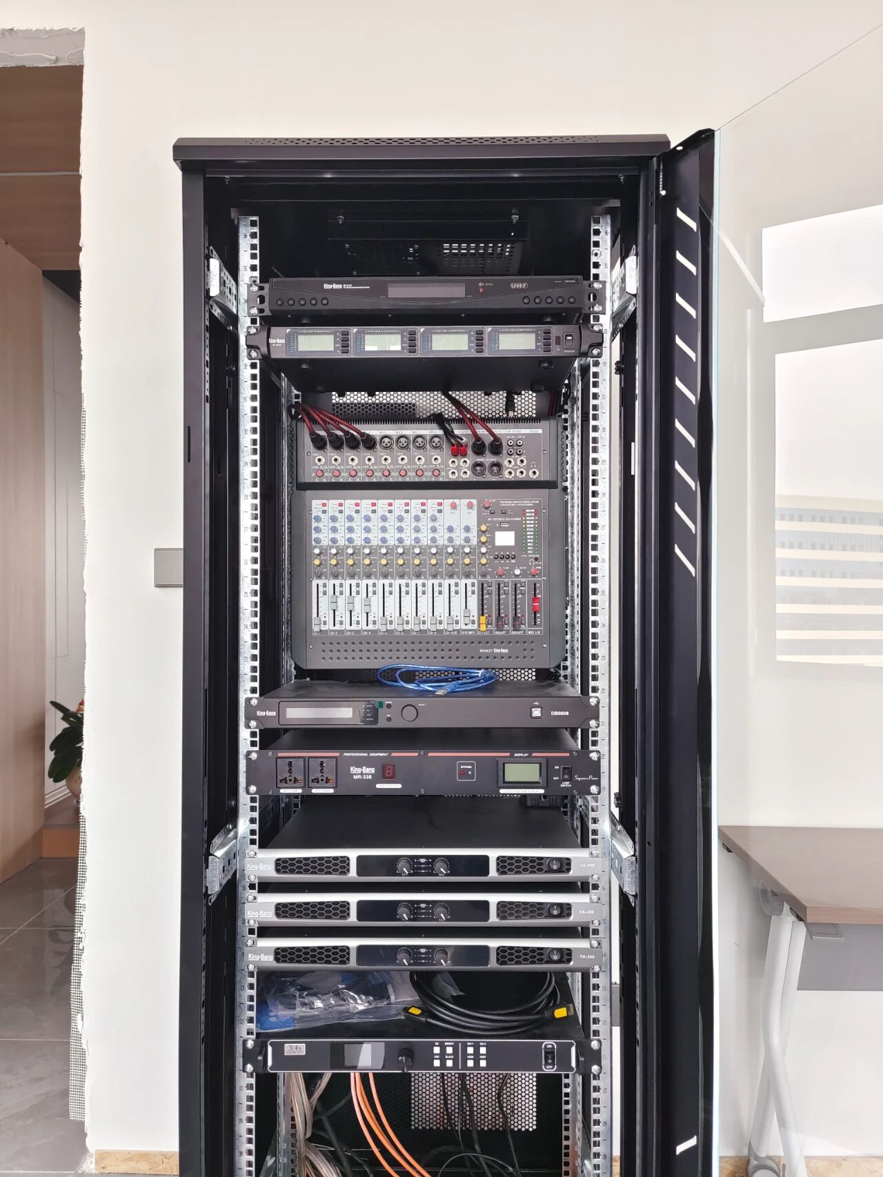 專(zhuān)業(yè)擴(kuò)聲系統(tǒng)簡(jiǎn)單來(lái)說(shuō)就是把聲音信號(hào)放大,主要由聲源、音頻處理設(shè)備、功放及揚(yáng)聲器系統(tǒng)組成。通過(guò)計(jì)算會(huì)議室的音響場(chǎng)地系數(shù)進(jìn)行設(shè)計(jì),保證會(huì)議室每個(gè)角落的聲場(chǎng)聽(tīng)覺(jué)均勻,音響效果達(dá)到語(yǔ)言清晰、無(wú)失真、聲場(chǎng)分布均勻。